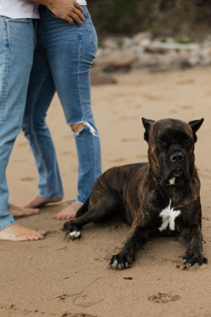 We kicked off our evening adventure at Sand Beach, where Meagan and Jason brought along their adorable dog, Maui. There’s nothing like watching a couple run barefoot through the surf with their pup chasing after them!!